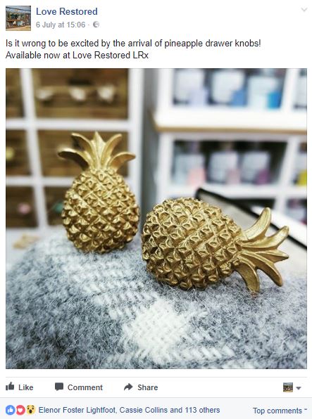 The consistent and engaging content works well for Love Restored, they mix posts on furniture projects of their own with sales messages. But showing customers what they can do rather than telling them what to buy works fantastically for subtly selling their pieces and paints.